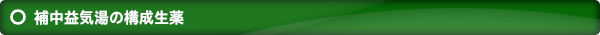 消化器、呼吸器機能を元進する黄耆(オウギ)・人参(ニンジン)・蒼朮(ソウジュツ)・甘草(カンゾウ)、血液を補う当帰(トウキ)、内臓下垂症に対応する柴胡(サイコ)・升麻(ショウマ)、消化器活性の陳皮(チンピ)・生姜(ショウキョウ)・大棗(タイソウ)・甘草で構成される漢方薬です。疲れやすい、食欲不振、浅い呼吸、内臓下垂等に使用されます。甘辛味で、温服が効果的です。